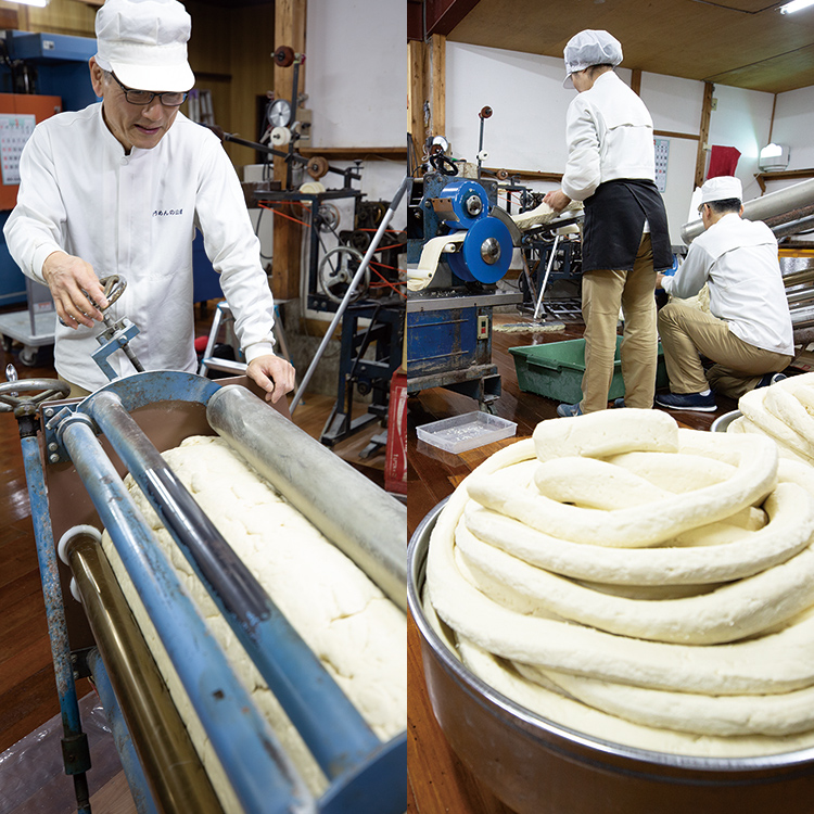 空が明るみかける頃、カシャカシャ、カシャカシャとけたたましい音が製麺所に鳴り響きます。機織りを思わせるようなノスタルジックな音。ホース程の太さにまでなった麺を、今度は足踏みミシンのような機械にかけて、さらに細く仕上げていきます。スルスルと糸を巻くように機械をくぐり抜けながら、一本ずつ製麺。ここでもひねりを入れて、