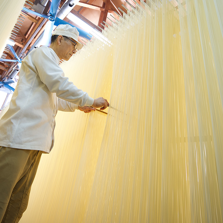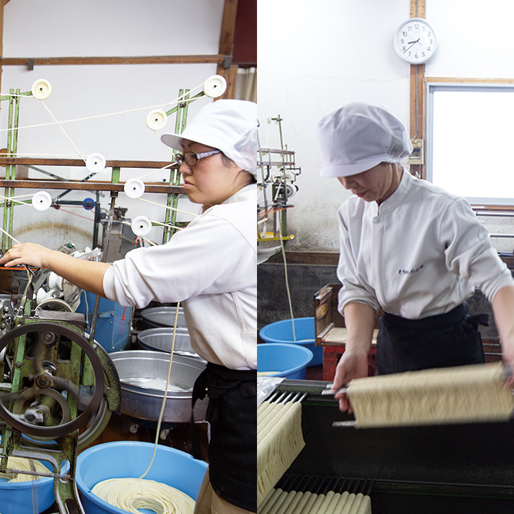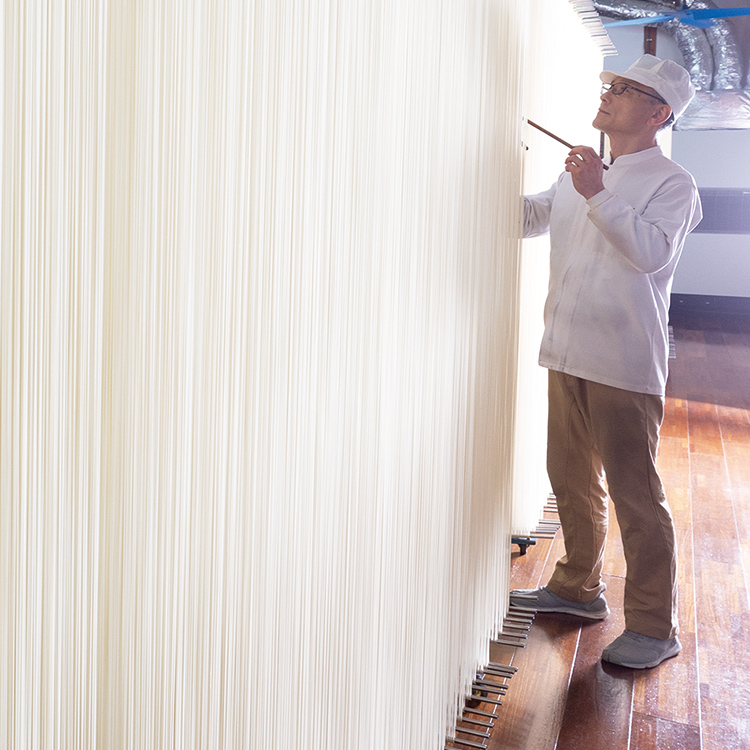 作り手が目で生地の状態を見ながら、手をかけ、寄り添いながら麺のお世話をすることが欠かせないのです。てまひまをかけて細く長い麵に延ばしていく。私たち手延べ職人の仕事は、昔も今も変わりません」。江戸時代から続く手延べの技とともに受け継いでいるのは、手延べ職人としての誇りと気概でした。