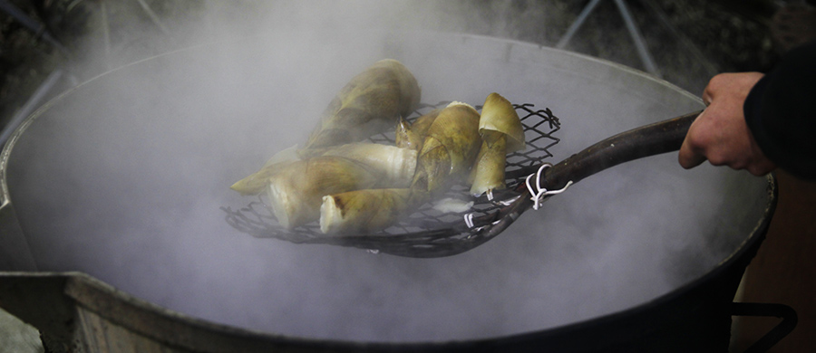 昔からそう伝えられてきたように、刻一刻と風味が変わる筍は、なによりも鮮度が大切。収穫し、すぐに茹でて甘みを引き出した、極上の「山茹で筍」だけを使用します。