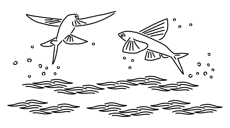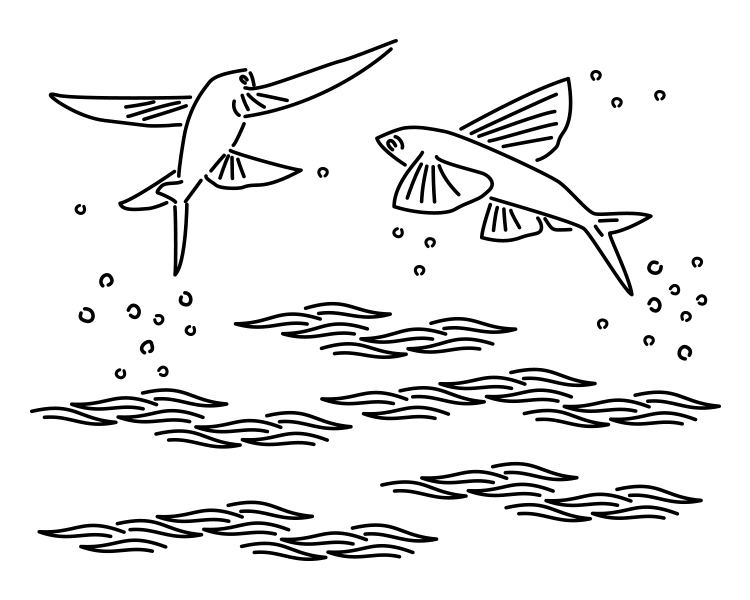 胸びれが翼のように大きく開くトビウオは、時速70kmほどの速さで水面下を泳ぎ、水上を飛ぶ際には100mから最長600mほどの距離を飛行するといわれています。日本各地にいる魚ですが、あご漁の盛んな長崎県ではトビウオは秋を告げる風物詩です。