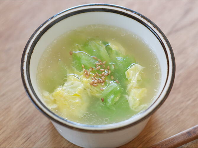 朝に摂りたい食材、卵と野菜を使ったスープです。包丁いらずで、たった数分で完成。ふわふわ卵に鶏だしのやさしい味わい、胡麻の風味も添えています。