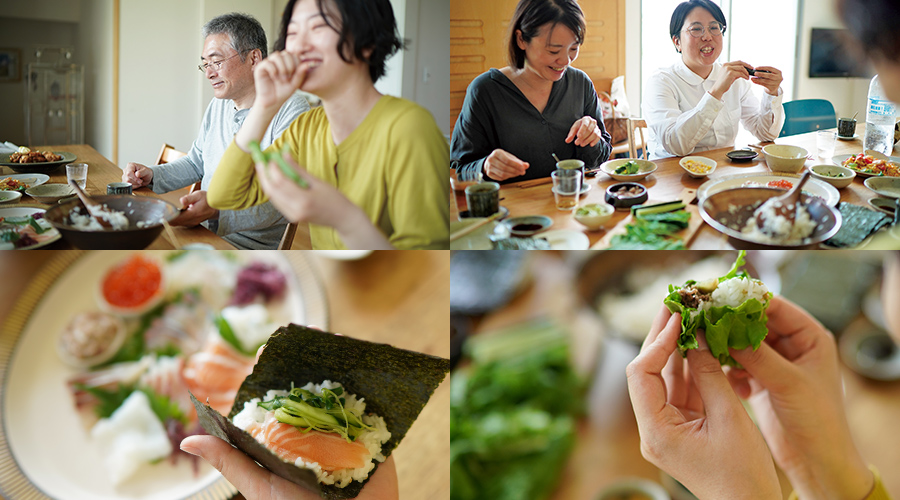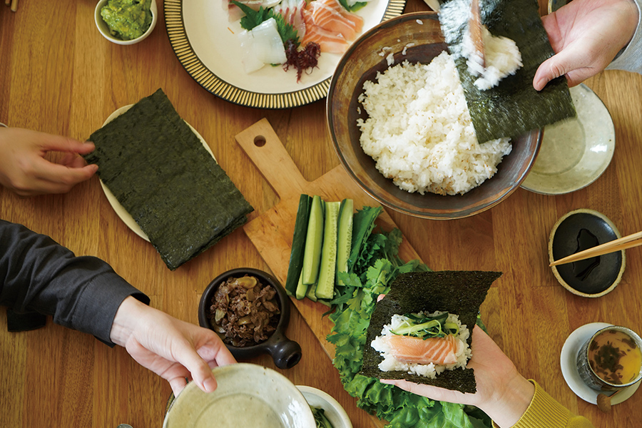 「次は、何の具を巻こうかな?」と、つくる工程もみんなで一緒に楽しめるのが、手巻き寿司のいいところ。あれもこれもと試したくなるワクワク感も満載です。