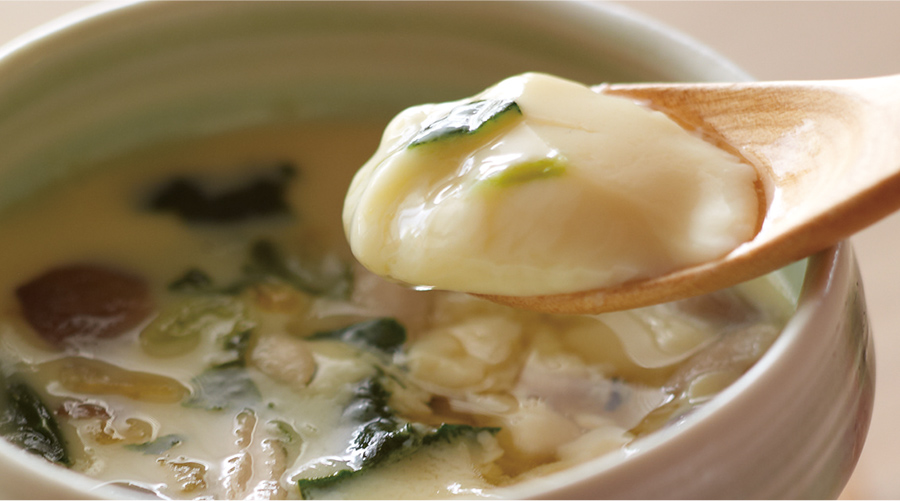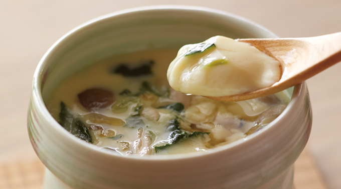手巻き寿司のもう1品で加えたいのは、茶碗蒸し。難しそうな印象ですが、茅乃舎のフリーズドライ「茶碗蒸し」があれば、蒸し器も技術も必要ありません。卵を加えて鍋で湯煎するだけなので、この日初めて作っても上手に仕上がります。