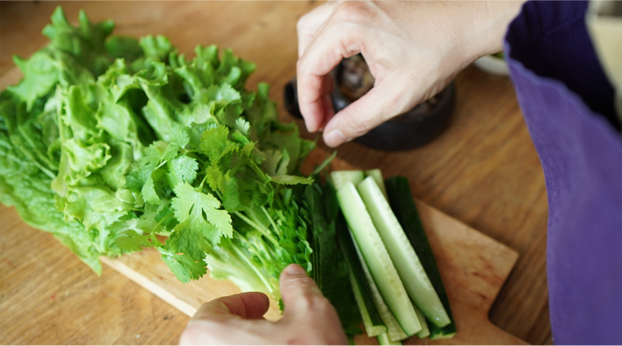 あっと言う間に準備を終えて、すぐに乾杯。あとは、のせて巻いて思い思いに。誰かがキッチンに籠ることもなく、みんなでゆっくりと語らいの時間を過ごせます。