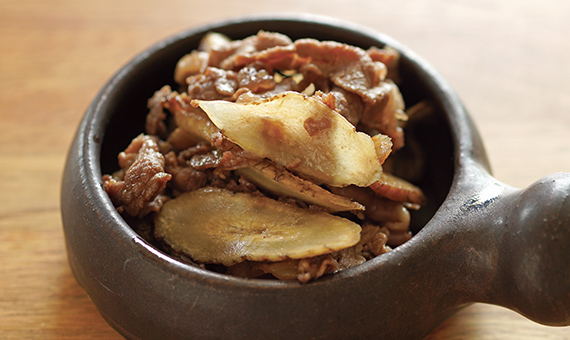 - ❷細切りの牛肉(250g)、薄切りの牛蒡(1/2本)を加え、汁けがなくなるまで煮る。