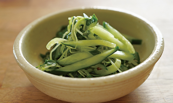 - 野菜も少し手を加えるだけで、味わいの印象が変わります。きゅうりと貝割れを寿司酢でさっぱりと仕上げましょう。