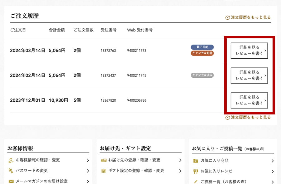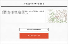 [キャンセル]画面で変更いただいた内容をご確認ください。内容に誤りのある場合は[前のページに戻る]を押していただき訂正をお願いいたします。内容がよろしければ[注文をキャンセル]ボタンを押してください。[変更完了]画面に移ります。