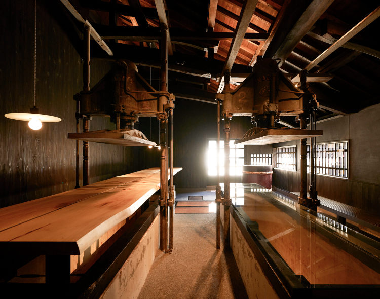 熟練の技もいる槽搾りは、手間と時間がかかりますが、できあがった酒はまろやかになり、酒粕も柔らかくおいしくなります。再興にあたり、「槽搾り」製法から設備が変わりますが、伊豆本店が大切にしてきた精神を伝え続けるため、その設備を「酒蔵BAR」のカウンターとして再利用しています。