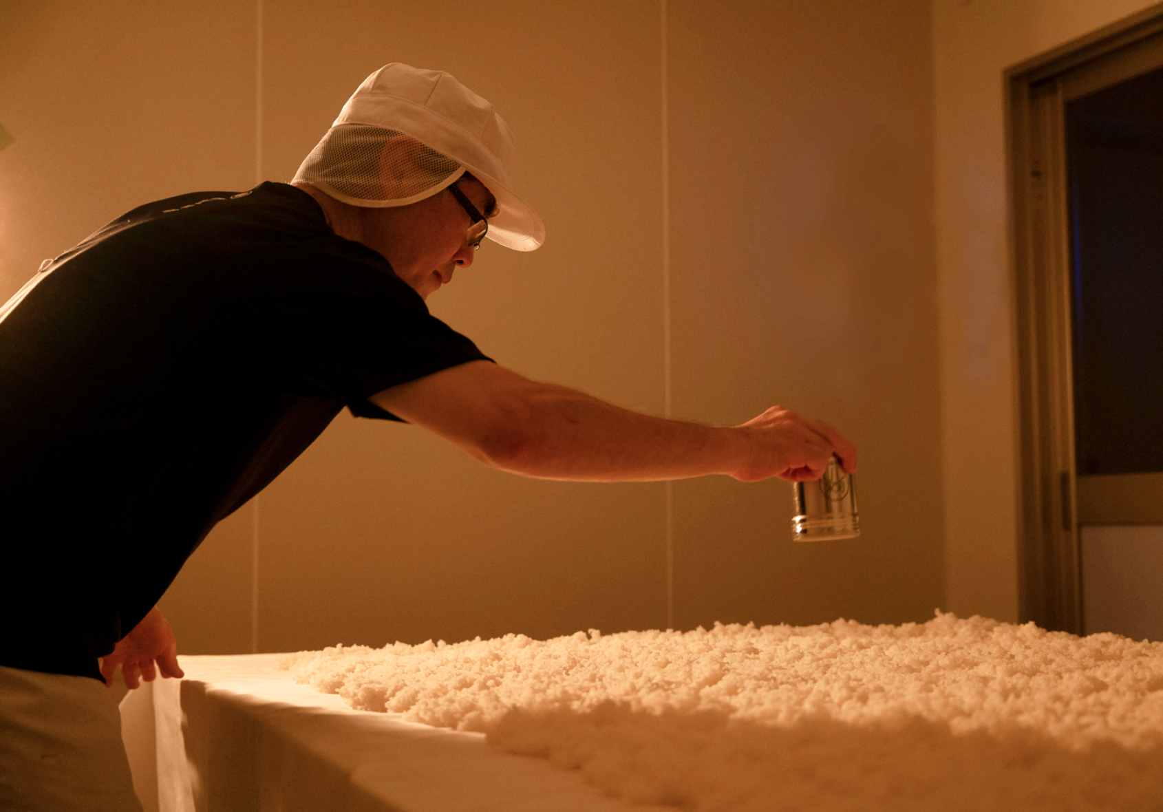 伊豆本店では、つい近頃まで、昔ながらの「槽搾り」という手作業の製法を採用していました。搾りは、日本酒と粕に分ける酒造りの最後の工程。槽搾り製法とは、発酵を終えたもろみを目の粗い酒袋に入れて、“槽(ふね)”と呼ばれる道具に積み重ね、もろみの自重で自然と酒を絞り出す方法。その後、重しをおいて、酒を搾り出します。