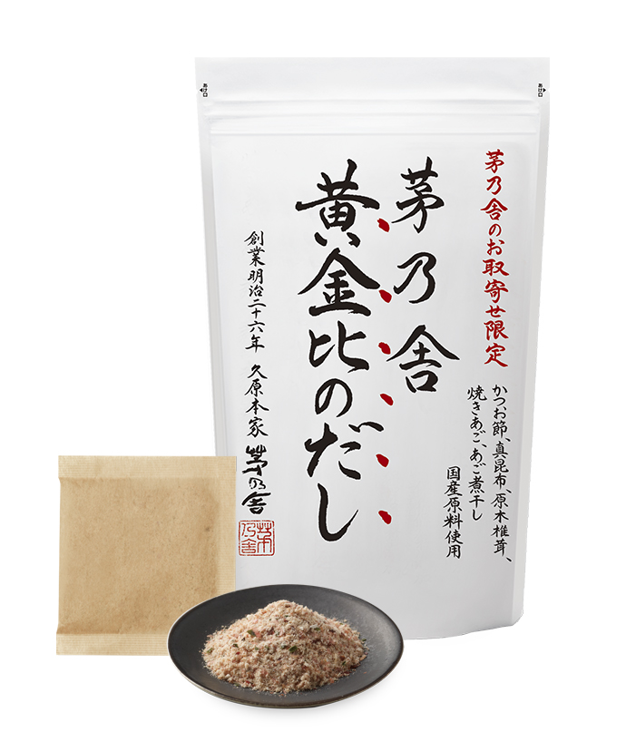 日本の3大うまみ素材と言われているかつお節・昆布・椎茸に九州らしい2種のあごを加え茅乃舎流の黄金比を追求した、通販・ネット限定のだしです。