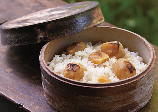 淡く上品な黄金比のだしが、栗と御飯をつなぎます。甘露煮の蜜を加えているためほんのり甘く、食事にもおやつにも合う栗御飯です。