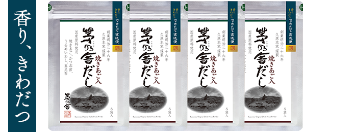 おいしいだしの条件は、鰹の華やかな香り。できたての茅乃舎だしは、香りがひときわ豊かです。袋を開けた瞬間に、その違いは歴然です。