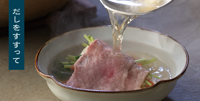 牛肉と千切りの人参や長葱、三つ葉などの野菜で、しゃぶしゃぶしましょう。味つけもせず、だしのおいしさ、素材のおいしさで楽しみます。