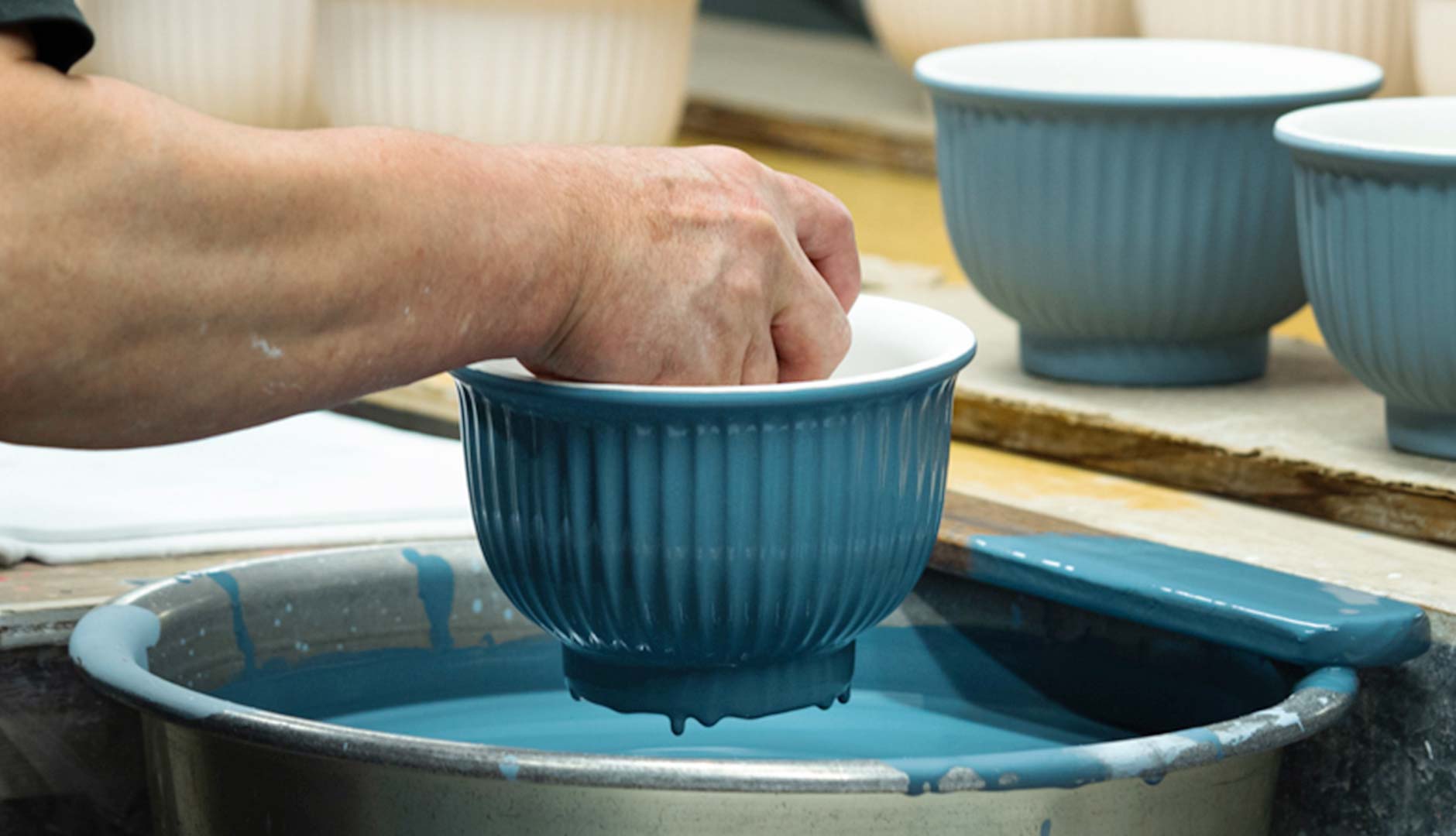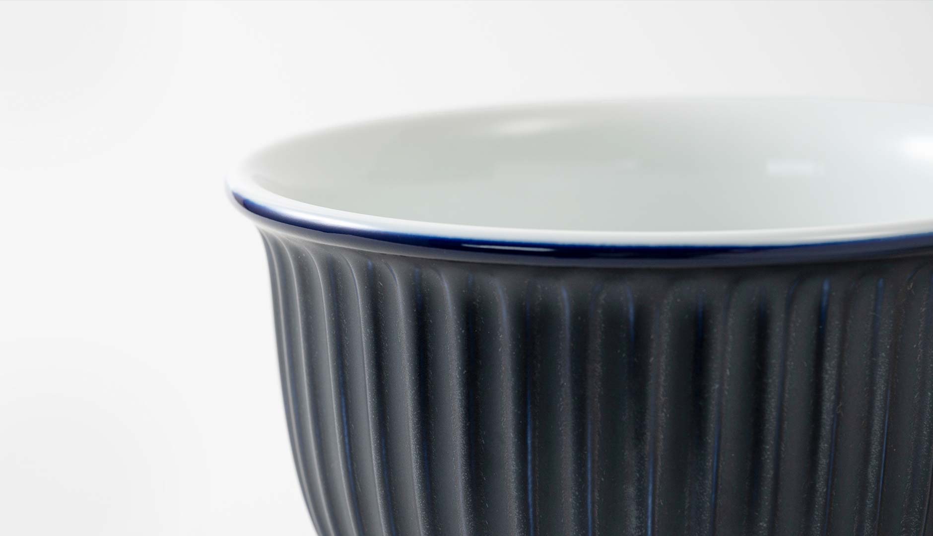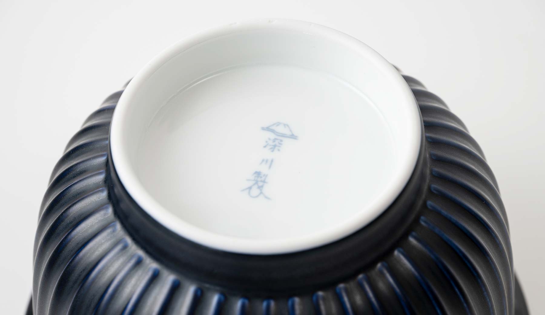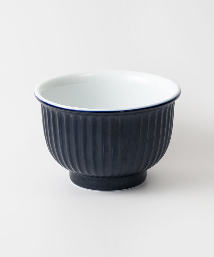 しのぎ深丼のために誕生した独自の瑠璃釉薬。顔料も自家調合する深川製磁が特別に考案してくださいました。瑠璃釉薬がしのぎ彫りのくぼみに溜まり、マットで深みのある質感と艶感の表情のちがいを楽しめます。