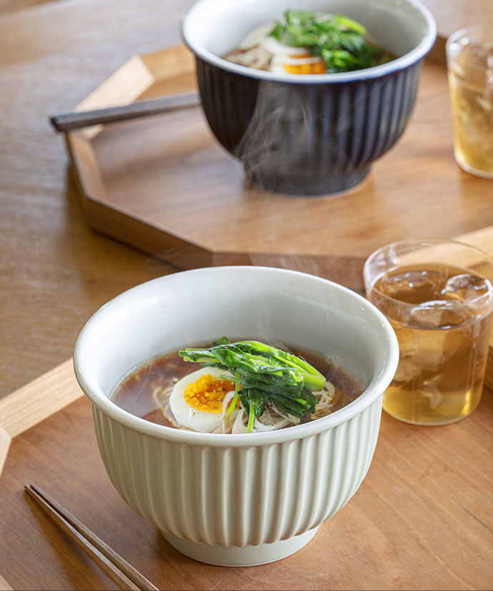 ラーメンはもちろんフォーなどのエスニック料理にもお似合い。美しい白が清涼感たっぷりに引き立てます。