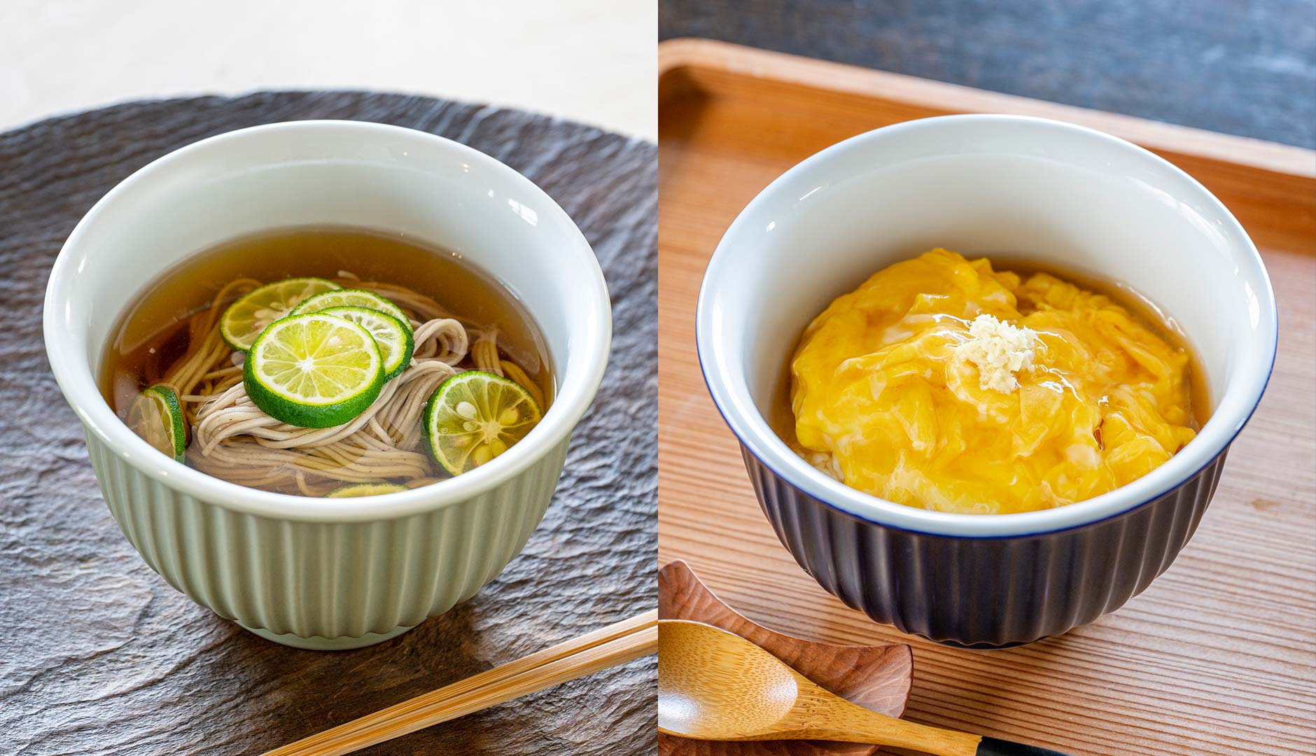 様々な料理を優しく受けとめる「青磁」。「瑠璃」は食卓を凛とした表情に。麺類にもご飯ものにも似合います。