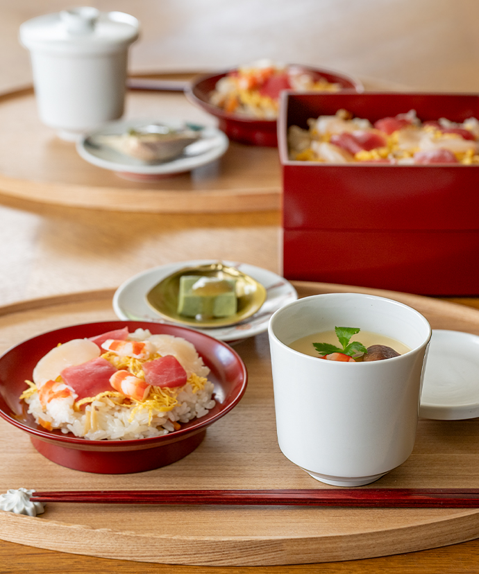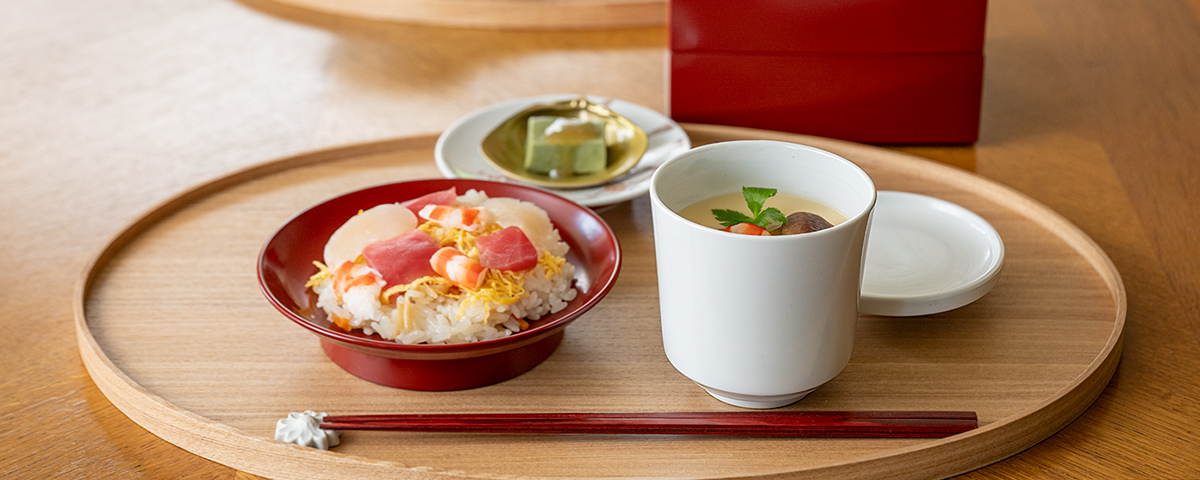 ひな祭りのちらし寿司に、手づくりの茶碗蒸しを添えて。蓋付碗があれば、お祝いの御膳がより豊かになります。
