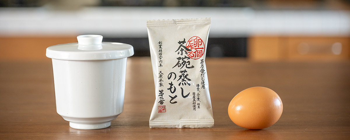 「蓋付碗」は茅乃舎のフリーズドライ「茶碗蒸しのもと」でつくるのにぴったりのサイズ。卵を混ぜて蒸すだけで簡単におつくりいただけます。