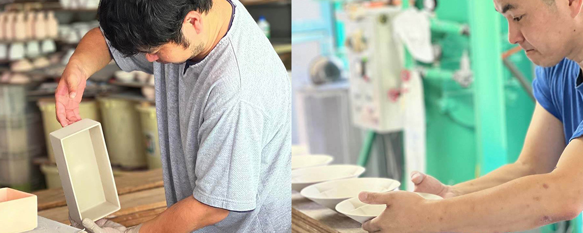 白磁は1670年創業の「瀬貞製陶所」製。近年は白磁釉薬を独自ブレンドした現代的な食器も手がけています(写真左)。鉄黒は1992年創業の「秀石窯」によるもの。自社で陶土を調合し、耐久性に優れた器を製作。成型技術を自負する窯元です(写真右)。