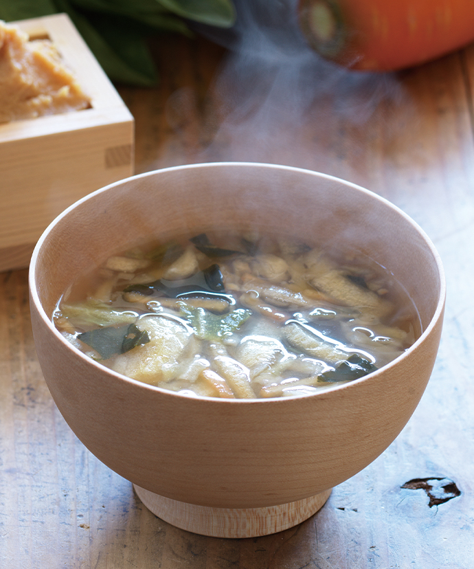 揚げ茄子の味噌汁、麩とわかめの赤だし、小松菜とお麩の味噌汁製造工場では卵、乳成分、えび、かにを含む製品を製造しております。