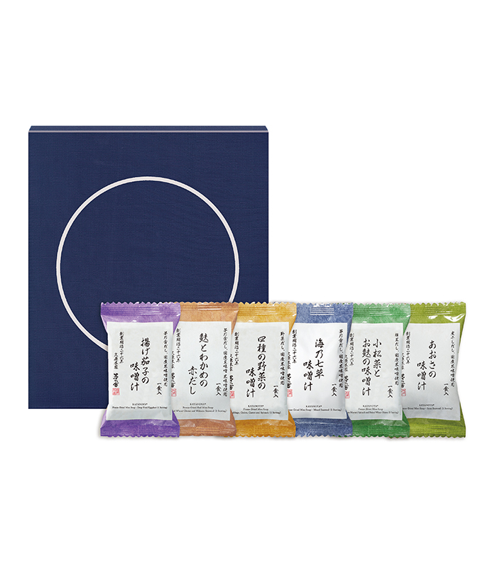 内容量:揚げ茄子の味噌汁(1食×2個)、麩とわかめの赤だし(1食×2個)、海乃七草味噌汁(1食×2個)、小松菜とお麩の味噌汁(1食×2個)、あおさの味噌汁(1食×2個)、四種の野菜の味噌汁(1食×2個)