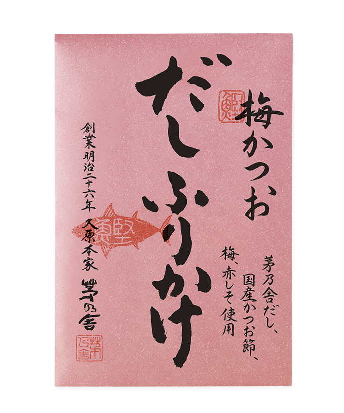 国産の鰹節に「茅乃舎だし」のうまみを含ませた。しっとり食感のふりかけ。刻み梅と赤しそで、さっぱり、風味豊かに。