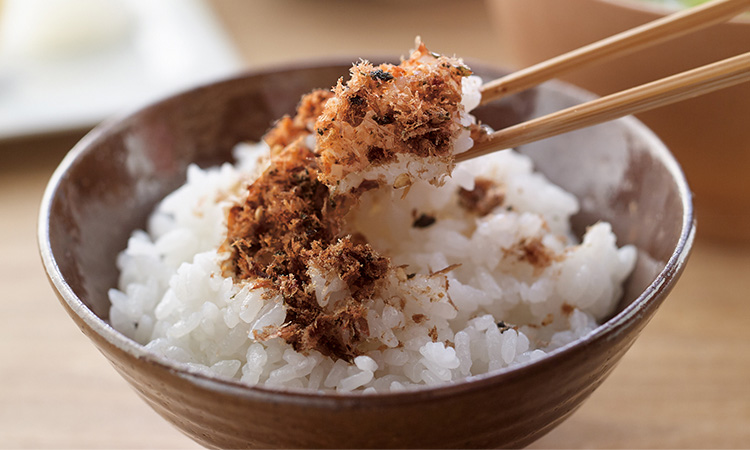 ひと口ごとに広がるだしのうまみにこだわって、削り方にも工夫を凝らした鰹節。風味の良い国産の鰹節に、茅乃舎だし、福岡県産丸大豆醤油などを合わせ、ていねいにうまみを含ませてしっとりと仕上げました。