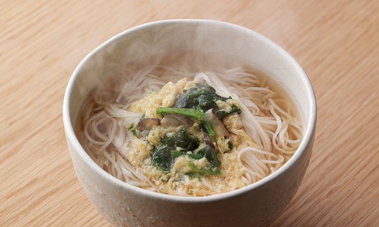 だしのうまみをしっかりと生かした特製つゆ。麺は、国産小麦粉を使用した手延べ製法のノンフライ麺。お湯をかけるだけでもっちりと仕上がります。