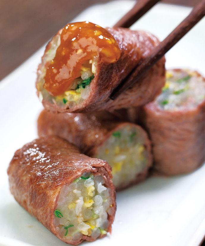 炒めた牛肉などを一緒に包んでいただいても美味しいです。