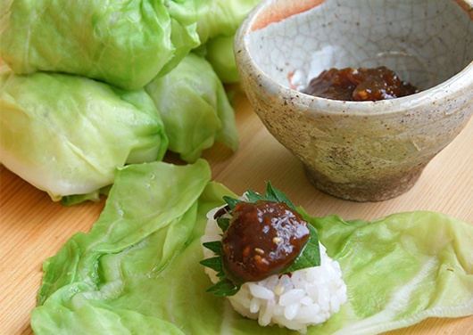 • 3. 炊き上がったごはんを小さなおにぎりにして、青しそと焼きにんにく味噌をお好みでのせ、2のキャベツで包んでいただく。