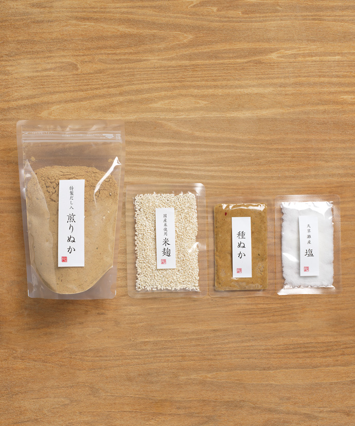 「御料理 茅乃舎」と同じ種ぬかをつかってつくる、ご自宅用のぬか床キットです。だしの風味を加えたぬか床なので一度目の漬け物からおいしくお召し上がりいただけます。