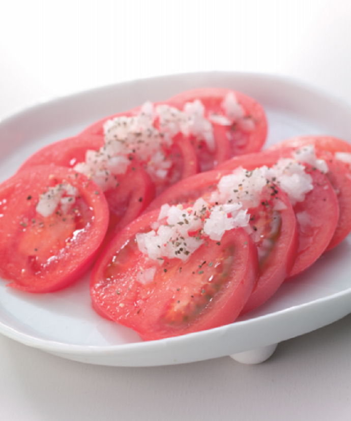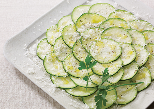 - 2. 1にバジルとガーリックのソルト、EXVオリーブ油を軽くふったらパルミジャーノ・レッジャーノを削りかけ、いただく直前にレモン汁を絞る。
