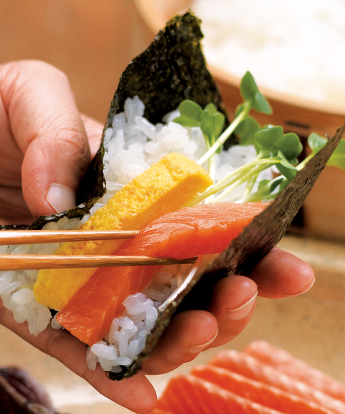 - 4. 巻きすの上に海苔を置き3を広げ、刺身、きゅうり、卵焼き、しそを手前に置いて巻く。同じようにもう3本つくる。