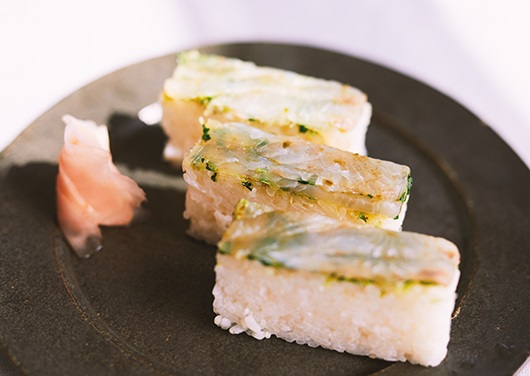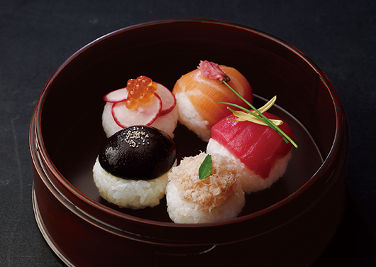 特選 茅乃舎極みだしで炊いたごはんをシャリにすれば、最後まで余韻が残る心尽くしのおいしさに。ネタは刺身や漬物のほか、おだしで調味した椎茸や鯛でんぶでひと工夫を。