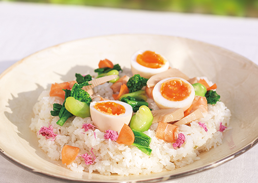 春の食材と卵で彩り豊かに。具材とごはんの調味には昆布だしを使って、上品な味わいに仕上げましょう。
