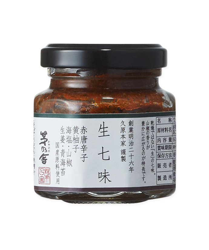 唐辛子の辛みに山椒の香り、胡麻や青海苔など七つの風味がとけあった「生七味」。