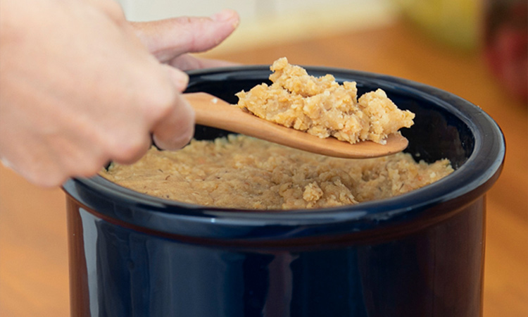 味噌から水分が出てきたときに外への漏れを防ぐため、仕込んだ味噌から容器の縁まで10㎝ほどの余裕があるとよいでしょう。