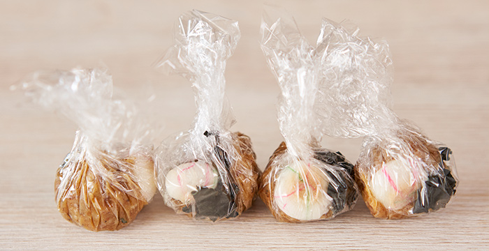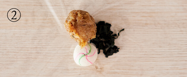 適当な大きさに切ったラップに、4等分した①と乾燥わかめ1g、乾燥麩1個をのせる。