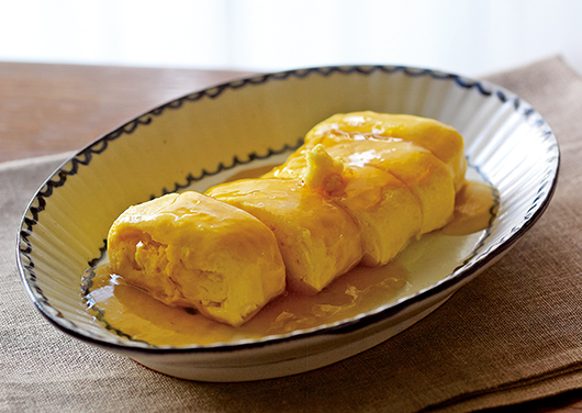 - 卵焼き器にサラダ油を熱して、1の1/4の量を流し入れ、表面が乾いたら三つ折りにする。同様に3回繰り返す。