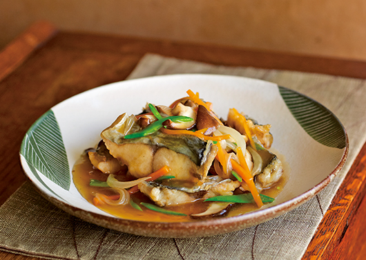 - 鰆は食べやすい大きさに切り、塩少々(分量外)をふり約10分置く。玉ねぎ・椎茸は薄切りにし、人参・絹さやは千切りにする。