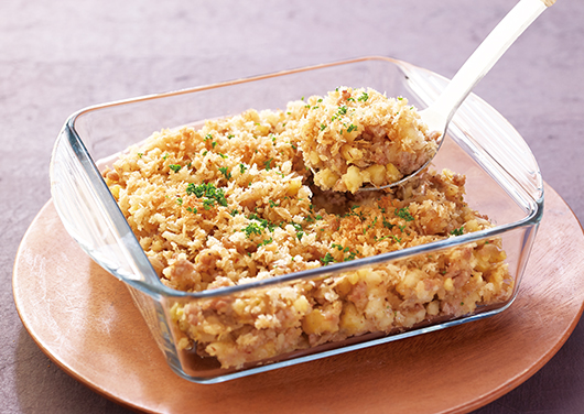 - 耐熱皿に詰め、表面にパン粉をふりかけ、オリーブ油を回しかける。トースターで焼き色がつくまで焼く。