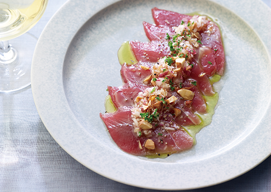 - アーモンドは粗みじん切りに、パセリと赤玉ねぎはみじん切りにする。鮪は薄く削ぎきりにしてよく冷やした器に並べる。