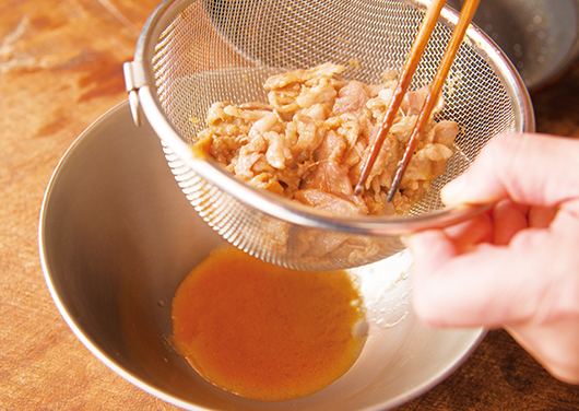 - 2に火が通ったら、ザルでこして肉と汁に分ける。