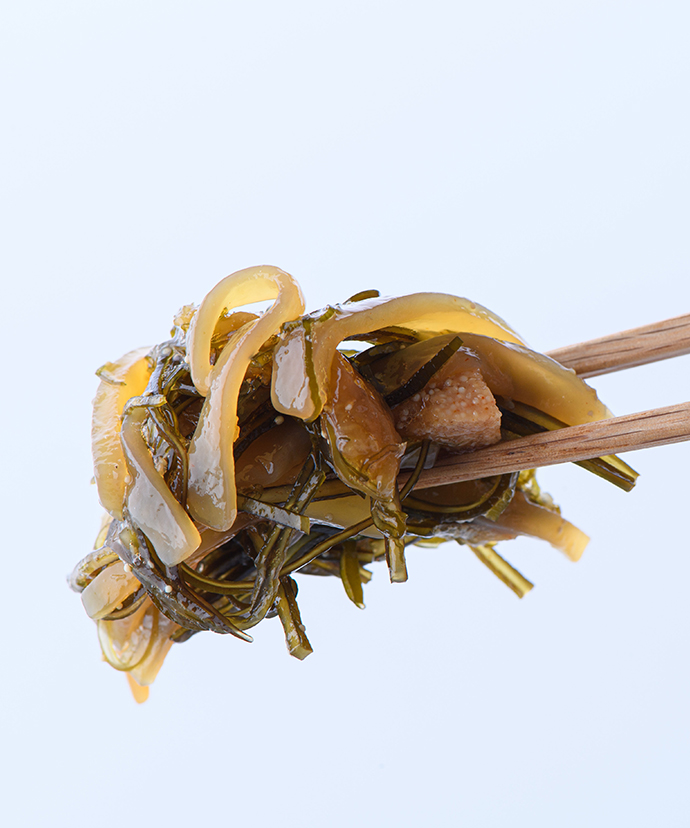 イカの味を引き立たせるために厳選した三種類の昆布、「猫足昆布」「がごめ昆布」「真昆布」に、さらに昆布だしめんたいこを合わせました。
