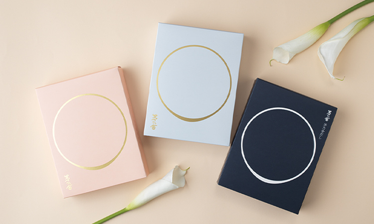 やさしい色合いの箱に、贈るお相手とのご縁がこれからも続くようにと円相をあしらった、お祝い箱「そら色」「さくら色」。晴れの日を祝福してくださった方々に感謝の気持ちを伝える、内祝いに最適な贈り物です。