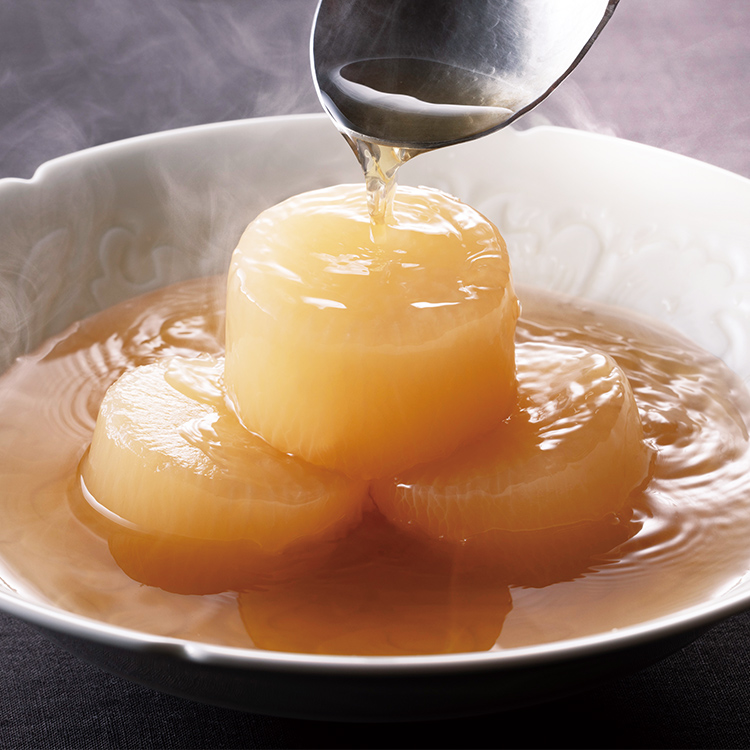 だしのうまみが芯まで染み込んだ、黄金色の大根。シンプルだからこそ、だしのおいしさをご実感いただける一品です。