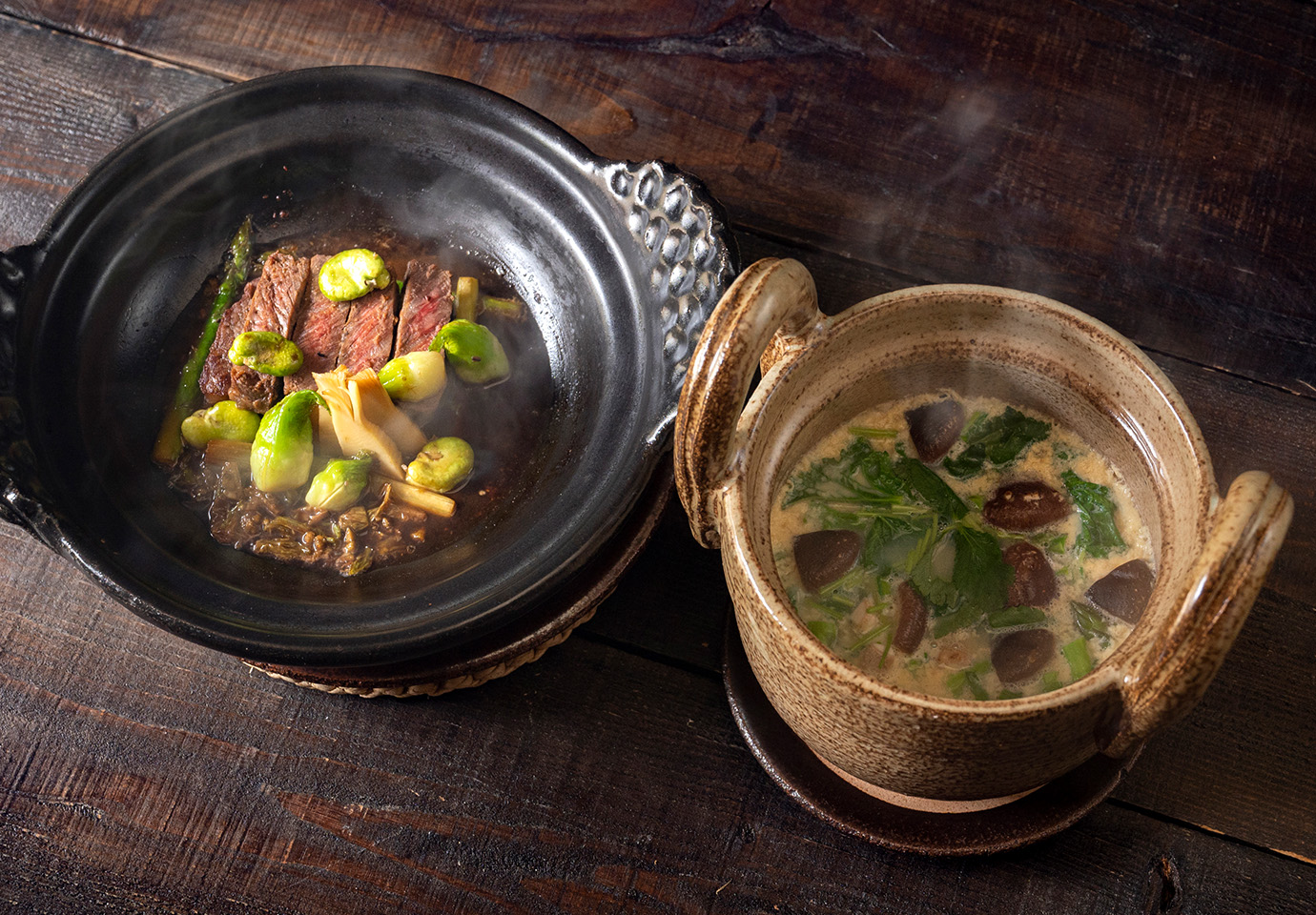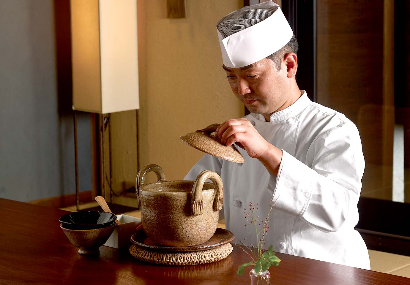 「御料理茅乃舎」では平成17年の開業以来、精米したてのお米を本品と同じ土鍋で炊き上げ、コース料理の最後にご提供。美しく粒立ちしたごはんはお客様から歓声をいただき、土鍋の風合いが味わいを後押ししてきました。