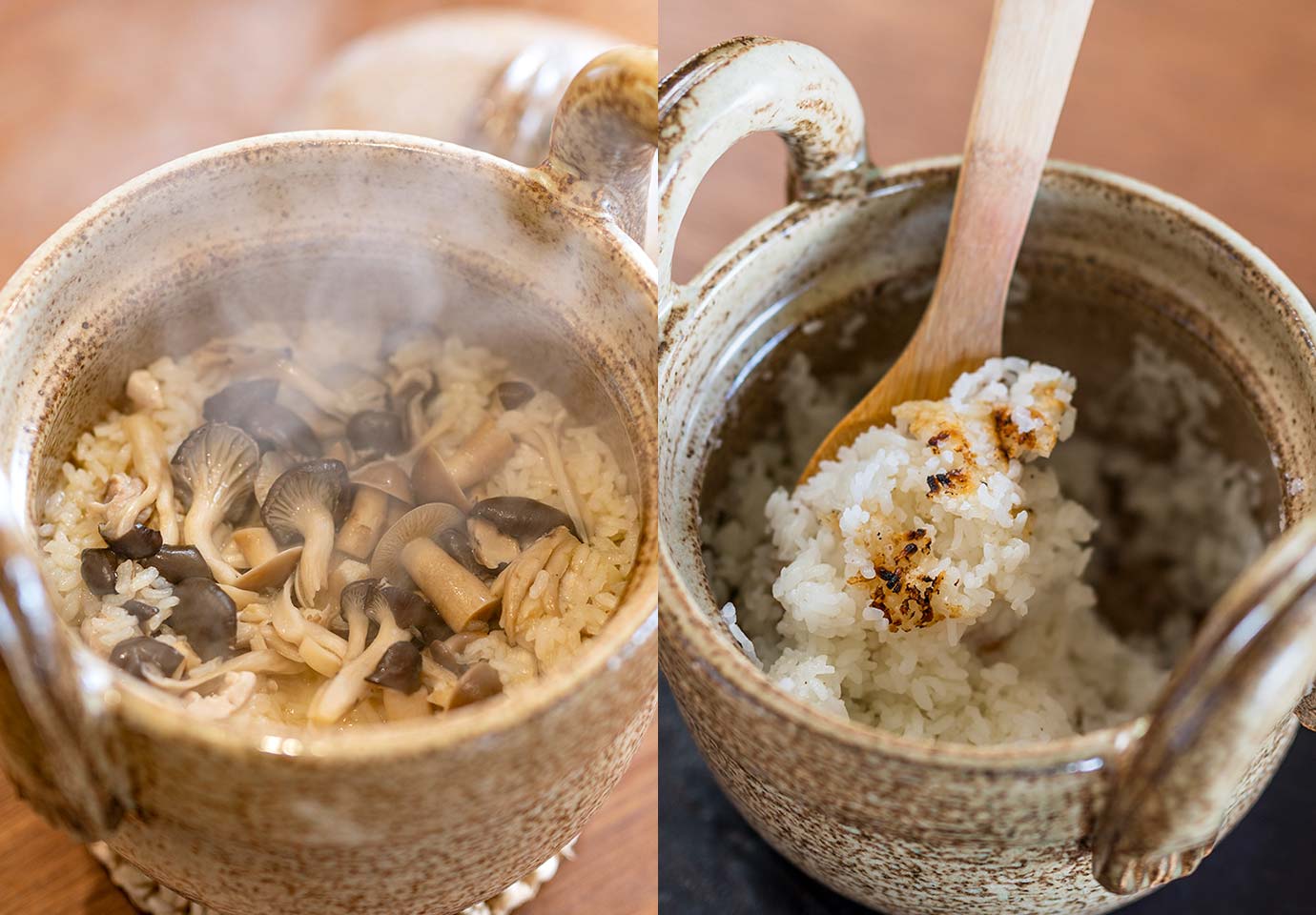 使い勝手に、見た目に、心満たされる土鍋で楽しむのは、手軽で美味なごはんもの。炊き込みご飯では旬の味覚を季節ごとに満喫。加熱時間を少し長めにしておこげをつくれば、香ばしさあふれる一杯に。
