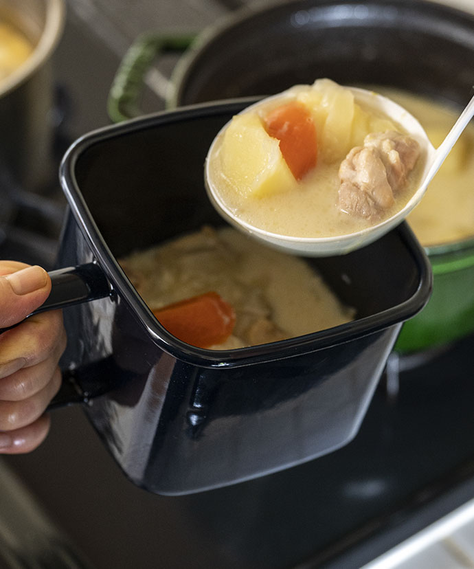 - 琺瑯は火にかけると大変熱くなります。必ず布巾などをしっかり当てて触れてください。