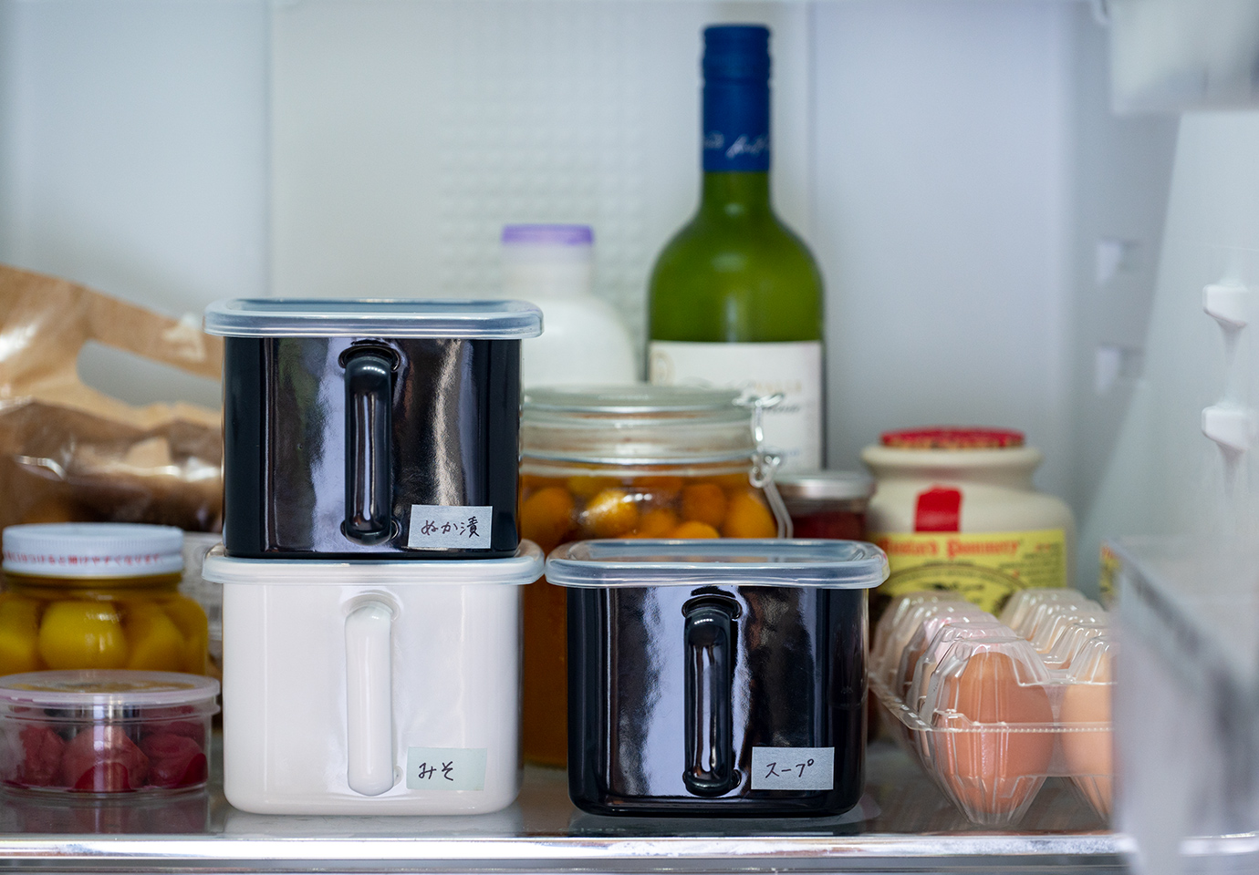 容器の高さは約9cm、奥行きは持ち手も含めて15.5cm。コンパクトなサイズで、冷蔵庫の中で2段に重ねることもできます。味噌以外にも、だしやお惣菜、乾物など様々な常備品を保存するのに活躍します。冷蔵庫を開けるたびに、琺瑯のやわらかな質感やこっくりした色合いが目に入り、優しい気持ちになれそうです。